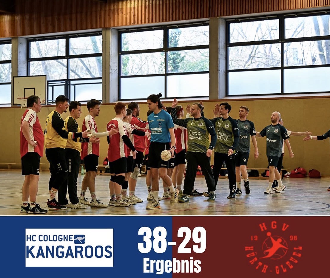 Eine schmerzhafte Niederlage mussten die Hürther beim Auswärtsspiel in Rodenkirchen hinnehmen. Personell geschwächt konnte man vor allem defensiv durch die Ausfälle von Reinhardt, Senter und kurzfristig Kügler nicht annähernd an das Niveau der letzten Wochen anknüpfen. Von Beginn an lief man einem Rückstand hinterher, den man im Laufe der ersten Halbzeit maximal auf zwei Tore verkürzen konnte, das letzte Mal als man aus einem 12:17 Rückstand auf 15:17 heran kam und noch ein zartes Pflänzchen am Leben ließ. Doch bereits kurz nach der Pause mussten auch die größten Optimisten daran zweifeln, ob die Gleueler noch etwas Zählbares mitnehmen können. Die zum Teil überharte Spielweise der Gastgeber hinterließ nun auch in der Offensive deutliche Spuren im Hürther Spiel und so hielten die Kangaroos den Abstand bei 3-5 Toren und profitierten dabei von einer Hürther Phase, in der zwischen der 41. und 51. Minuten kein Tor erzielt werden konnte. Mit dem 32:24 war die Vorentscheidung gefallen und letztendlich musste man sich 38:29 geschlagen geben.